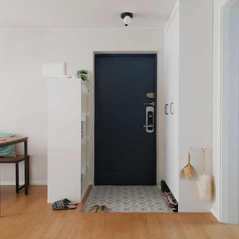 거실 입구의 파티션에는 상부 투명 유리가 붙어 있습니다. 파티션은 화이트 계열로, 중문은 블랙 계열로 시공되어 있습니다. 거실 입구의 파티션에는 상부 투명 유리가 붙어 있습니다. 파티션은 화이트 계열로, 중문은 블랙 계열로 시공되어 있습니다.